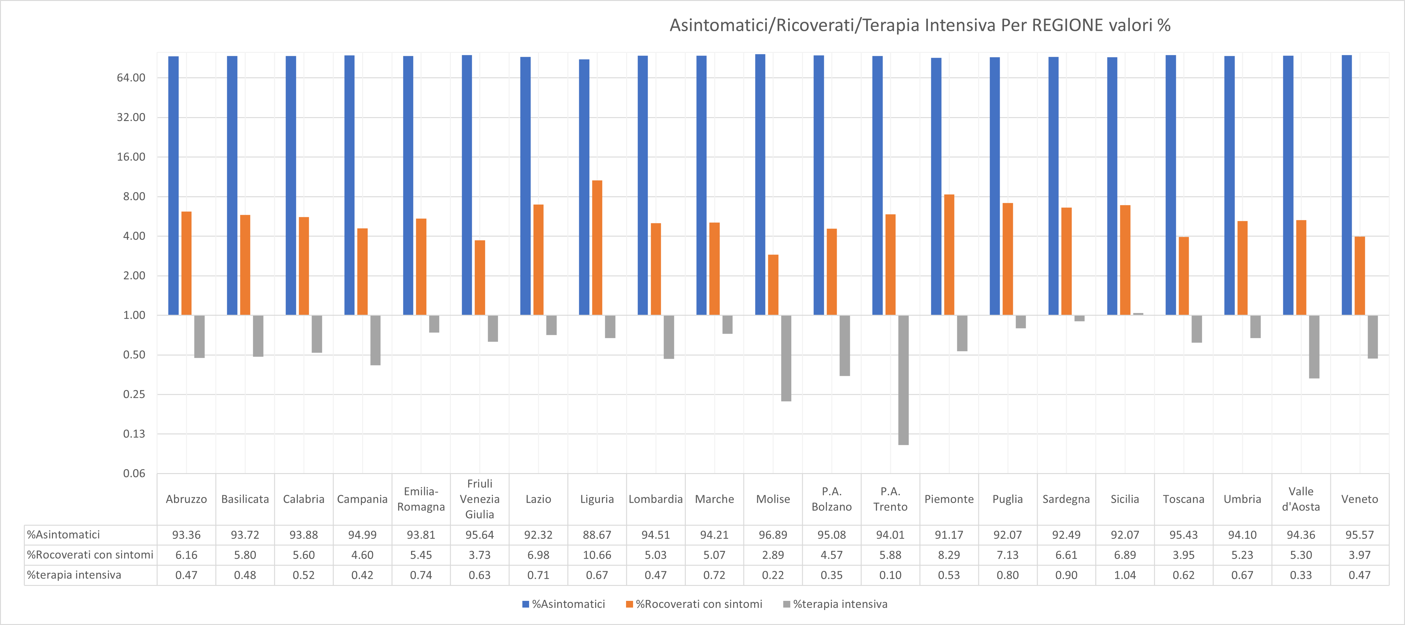 I valori regionali seguono il trend globale senza significative variazioni, ad eccezione della Liguria che ha in numero % di ricoverati maggiore ed un minore numero di asintomatici.