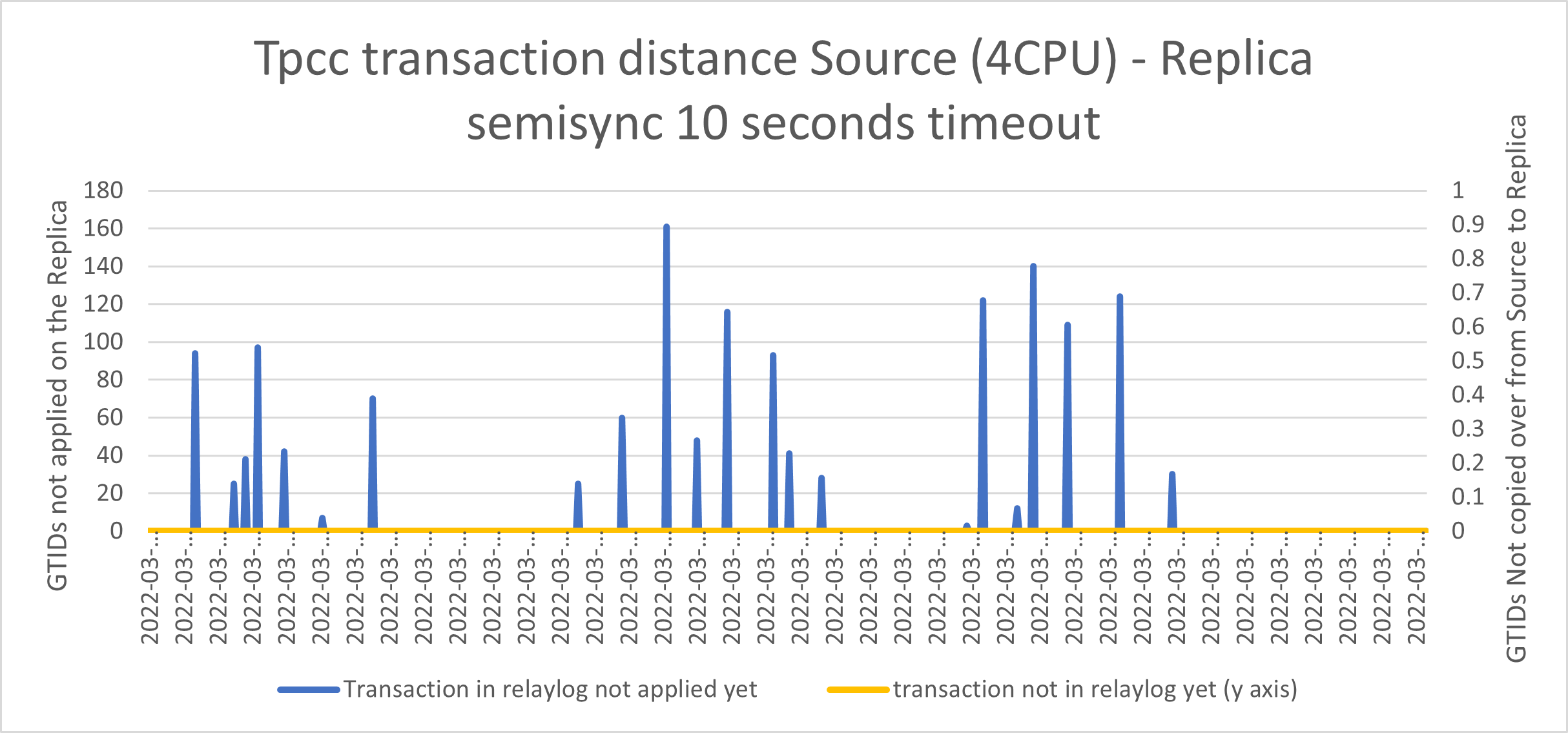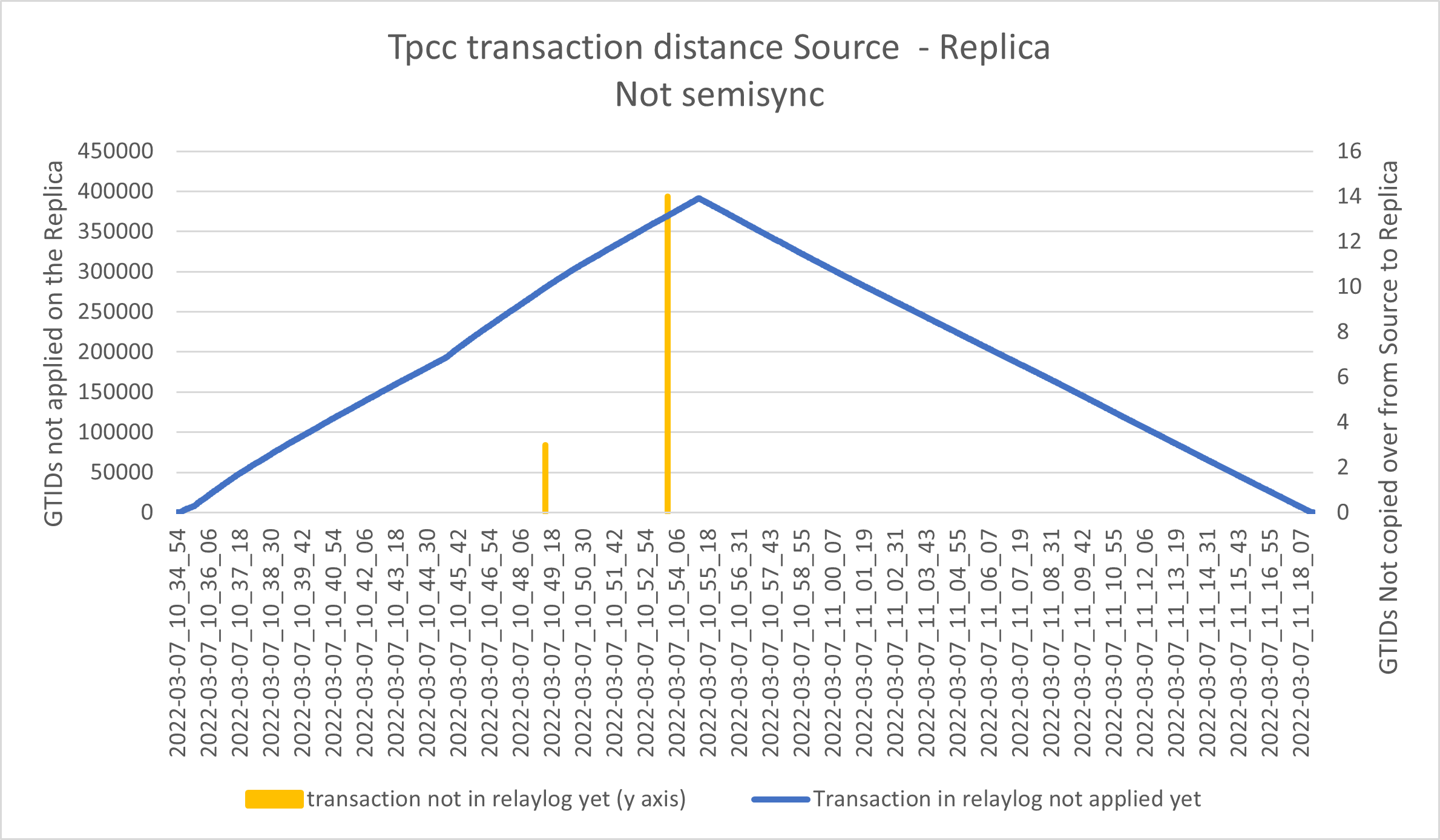- The yellow line represents the number of GTIDs “in flight” from Source to destination, Y2 axes. In case of Source crash, those transactions are lost and we will have data loss.